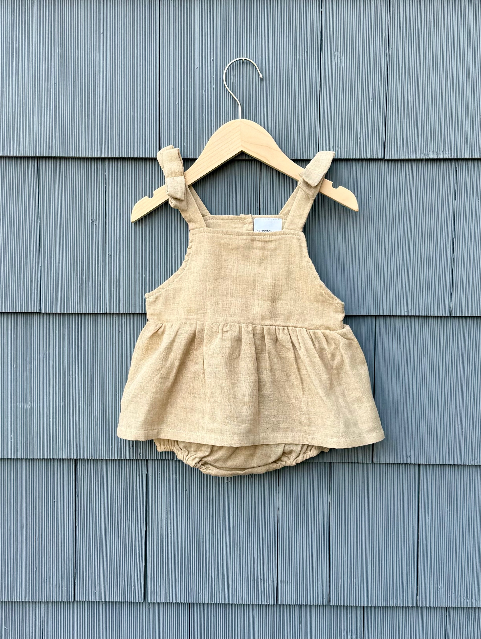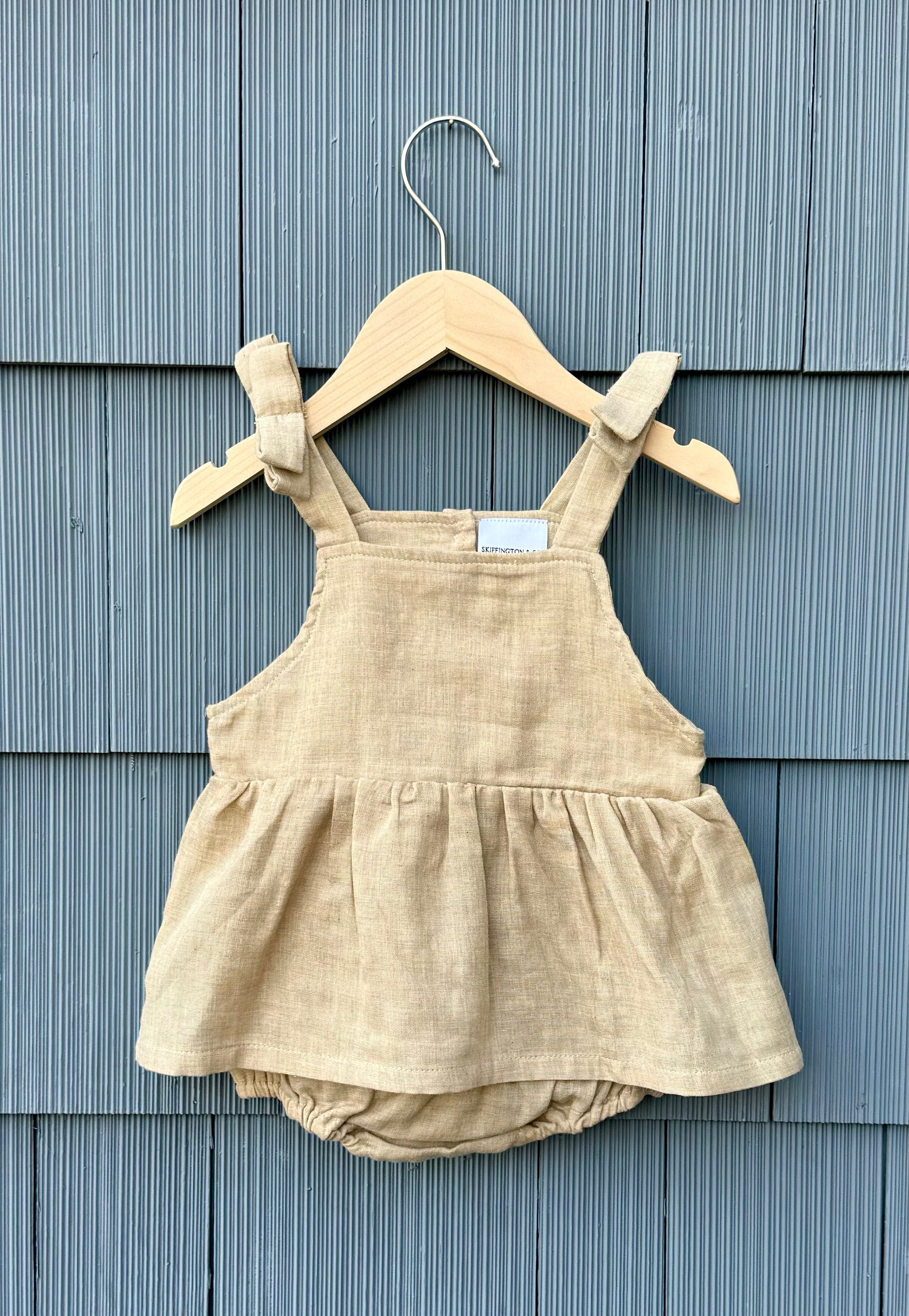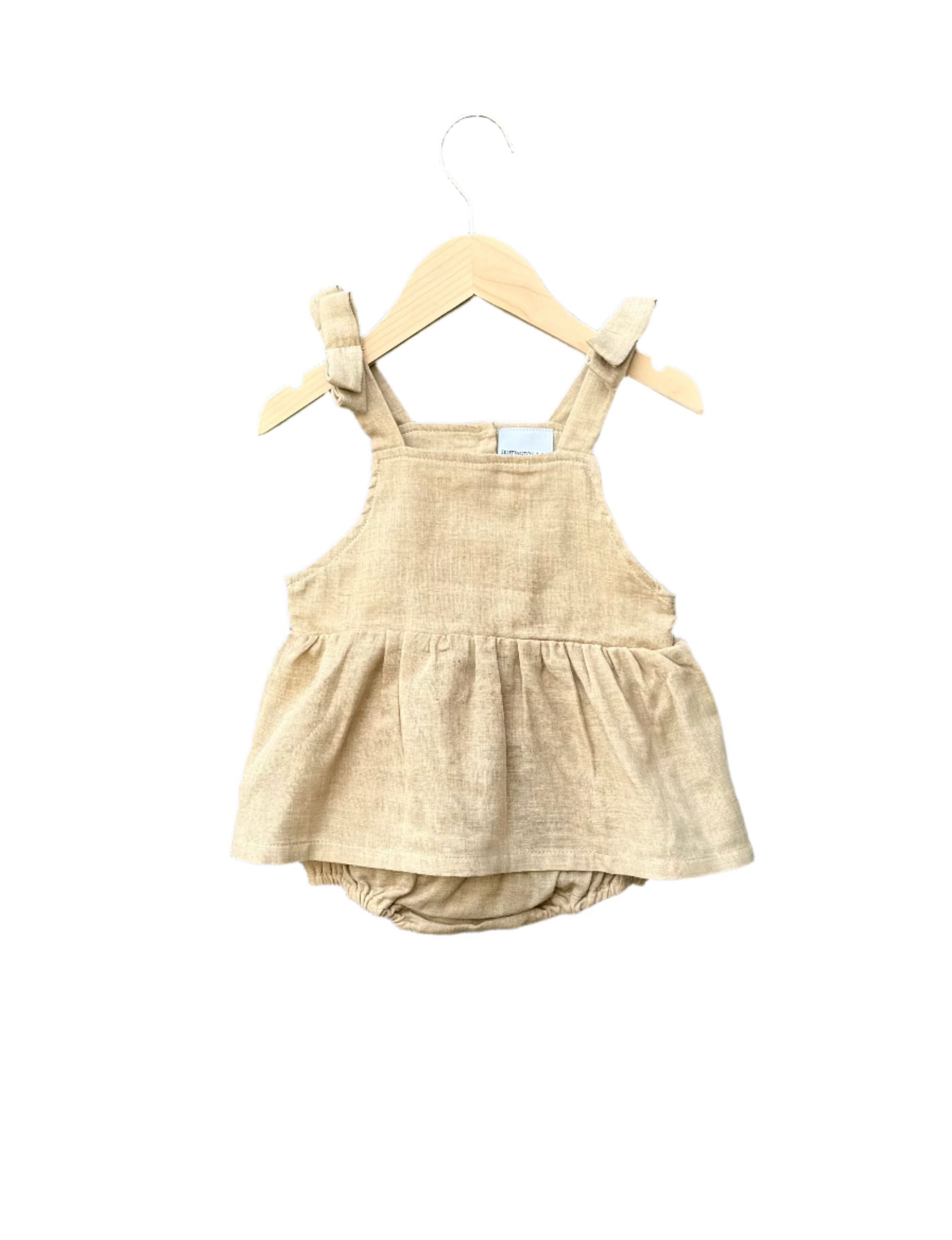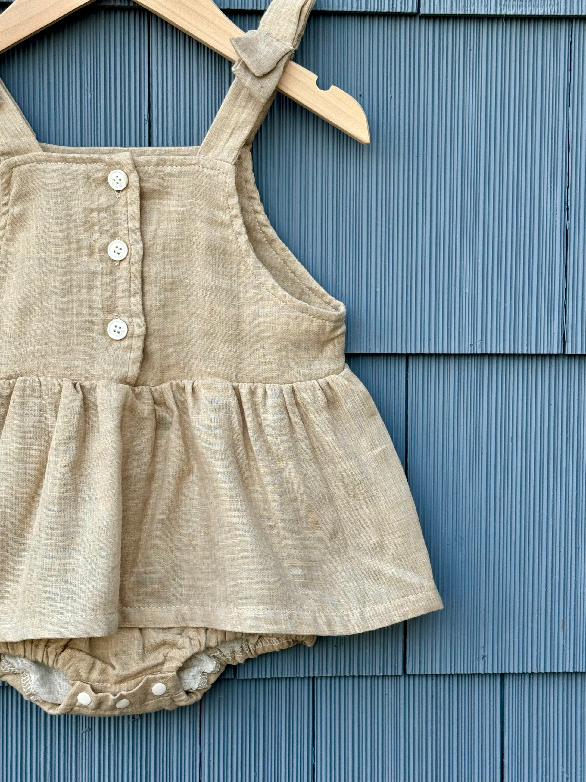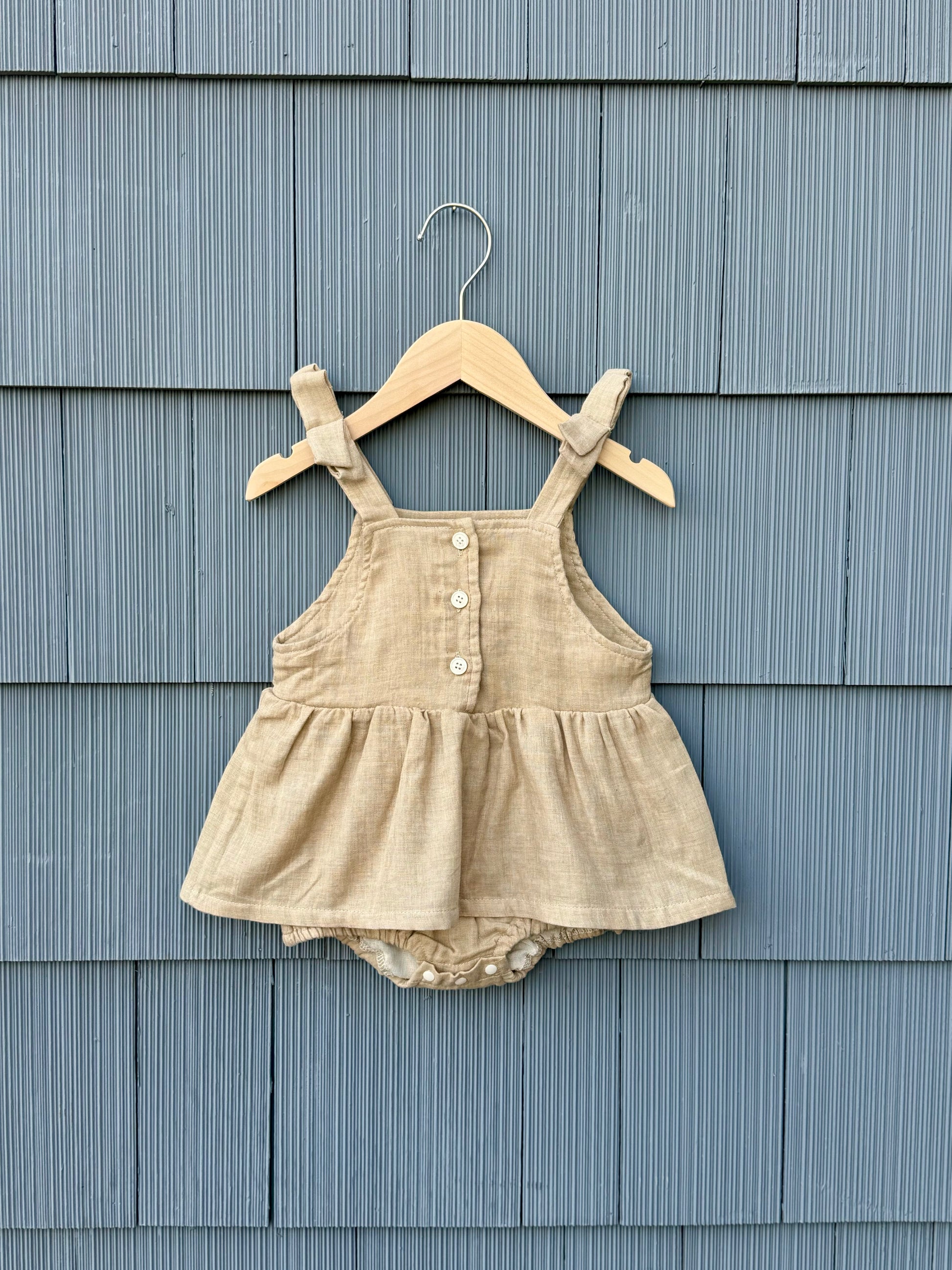This sweet and soft romper dress can be worn year round! In a beautiful neutral color- pair it with pretty much any other colors to complete your look. 100% buttery soft cotton, button back closure, and sweet double bows accent the shoulders.