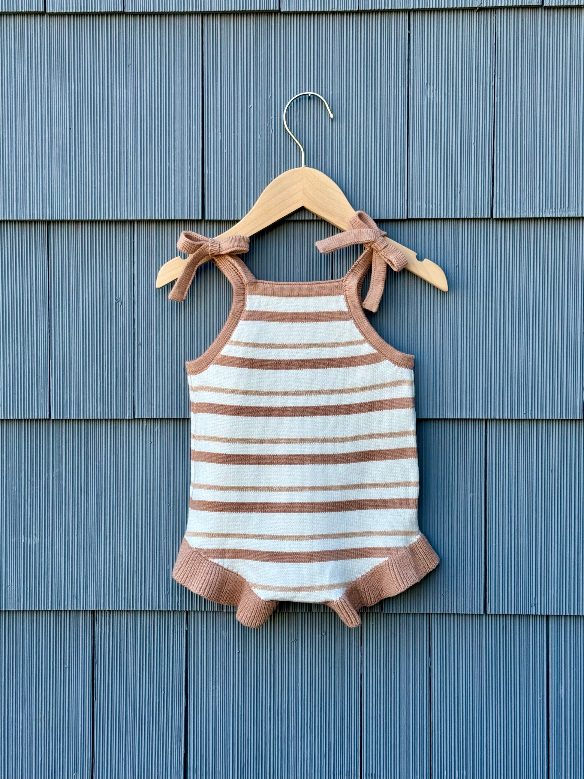 A classic cream and brown striped knit romper, with subtle ruffles at the legs. The hand-tied bows on the shoulders really give it that extra something special- 100% buttery soft with a three button closure. Another timeless piece that will be worn for years to come!