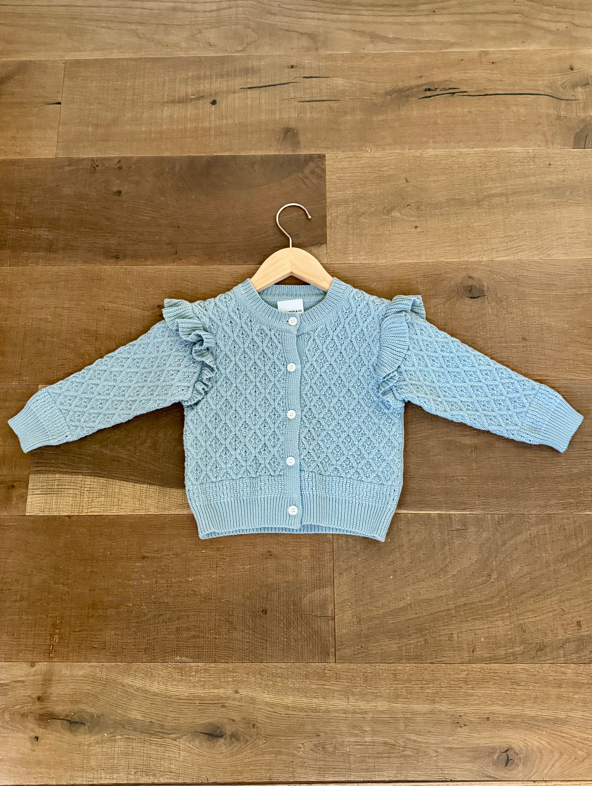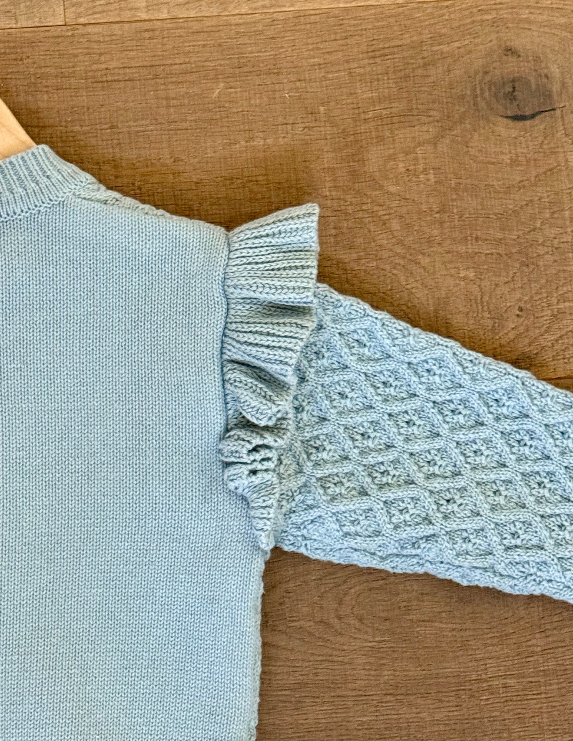 100% cotton in a beautiful muted blue, this sweater adds a touch of style and grace to any outfit. Charming ruffled shoulder details and traditional style knitted front.