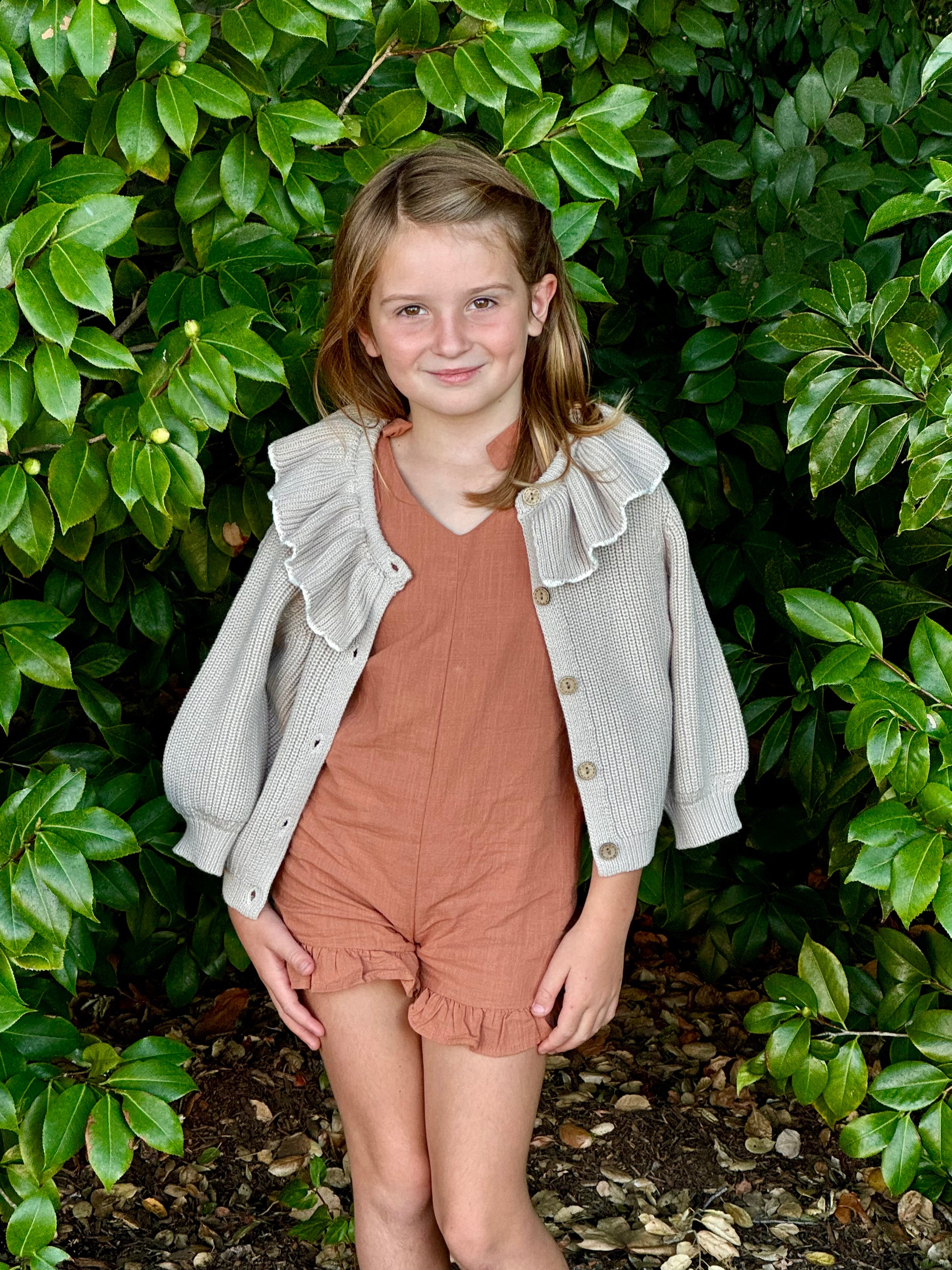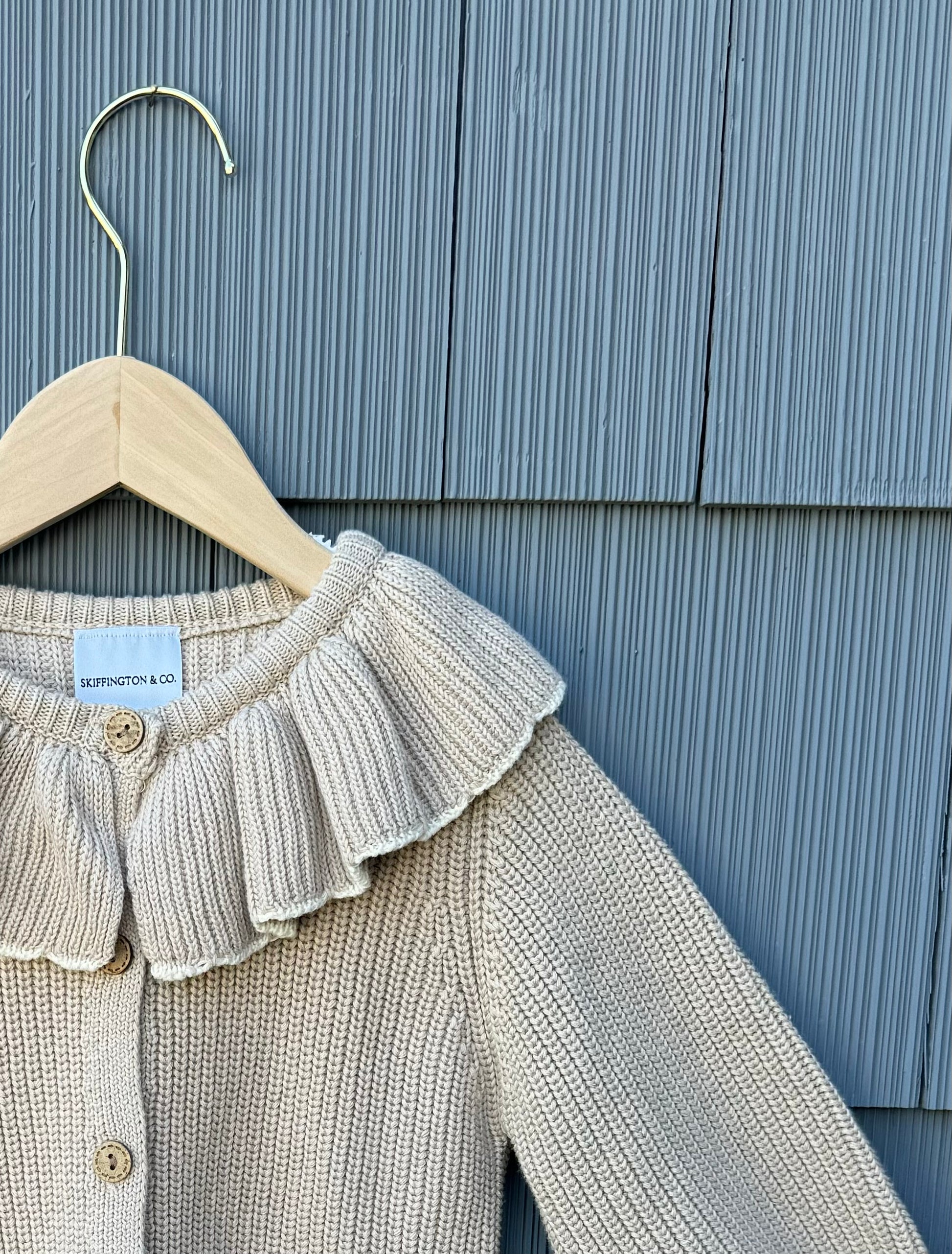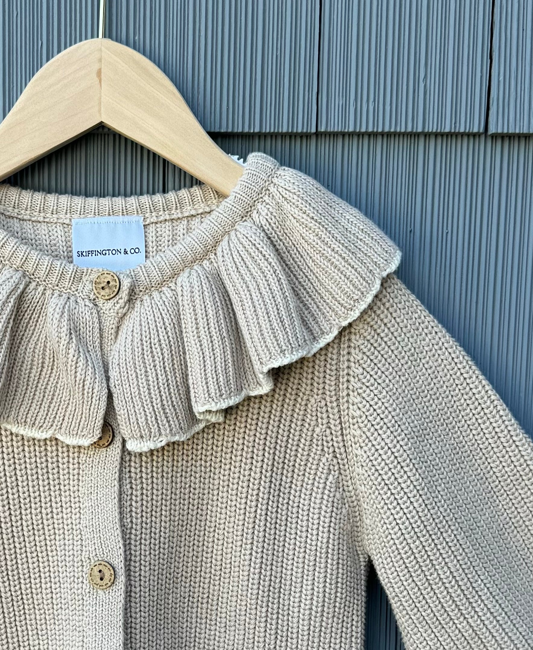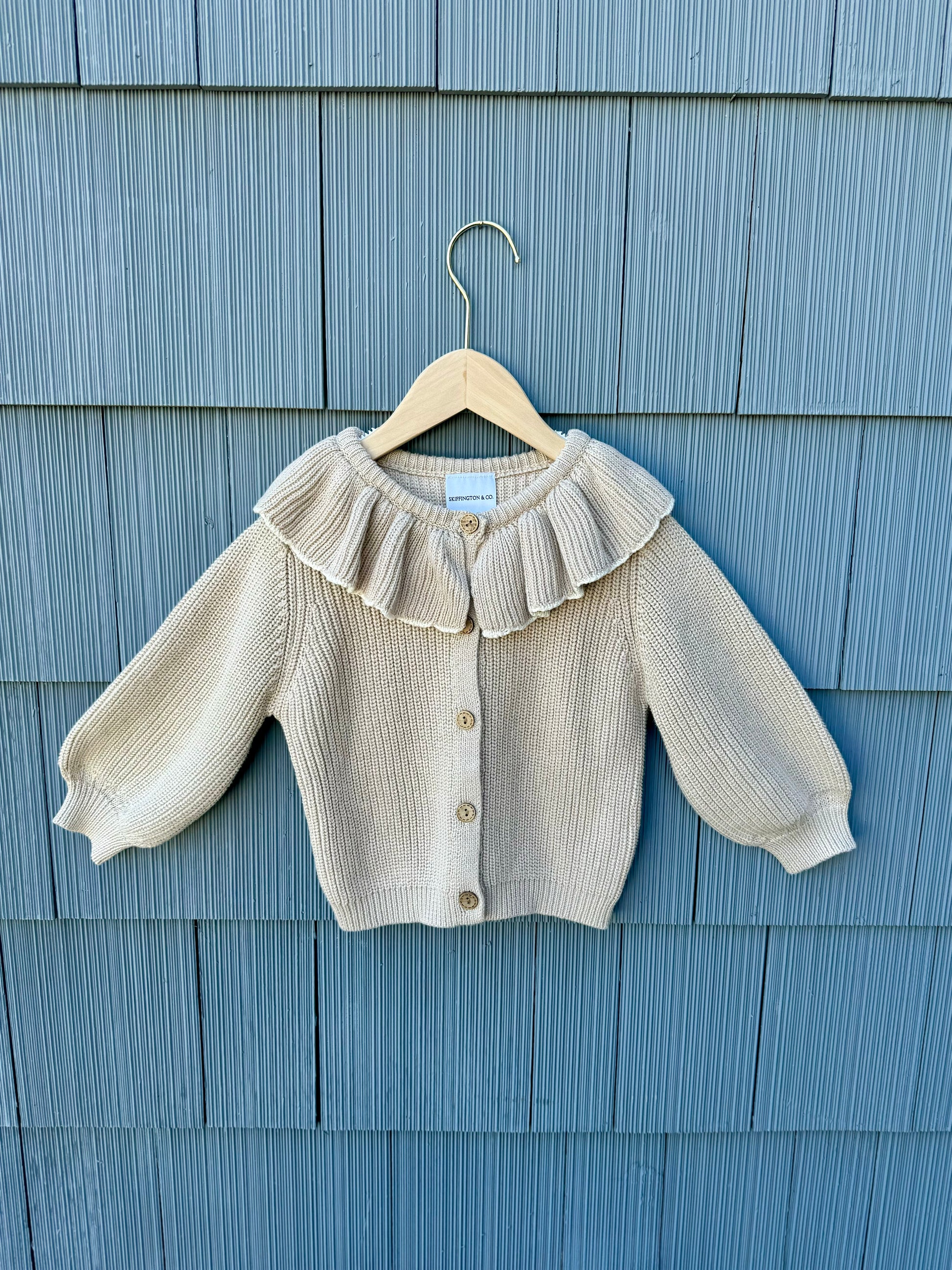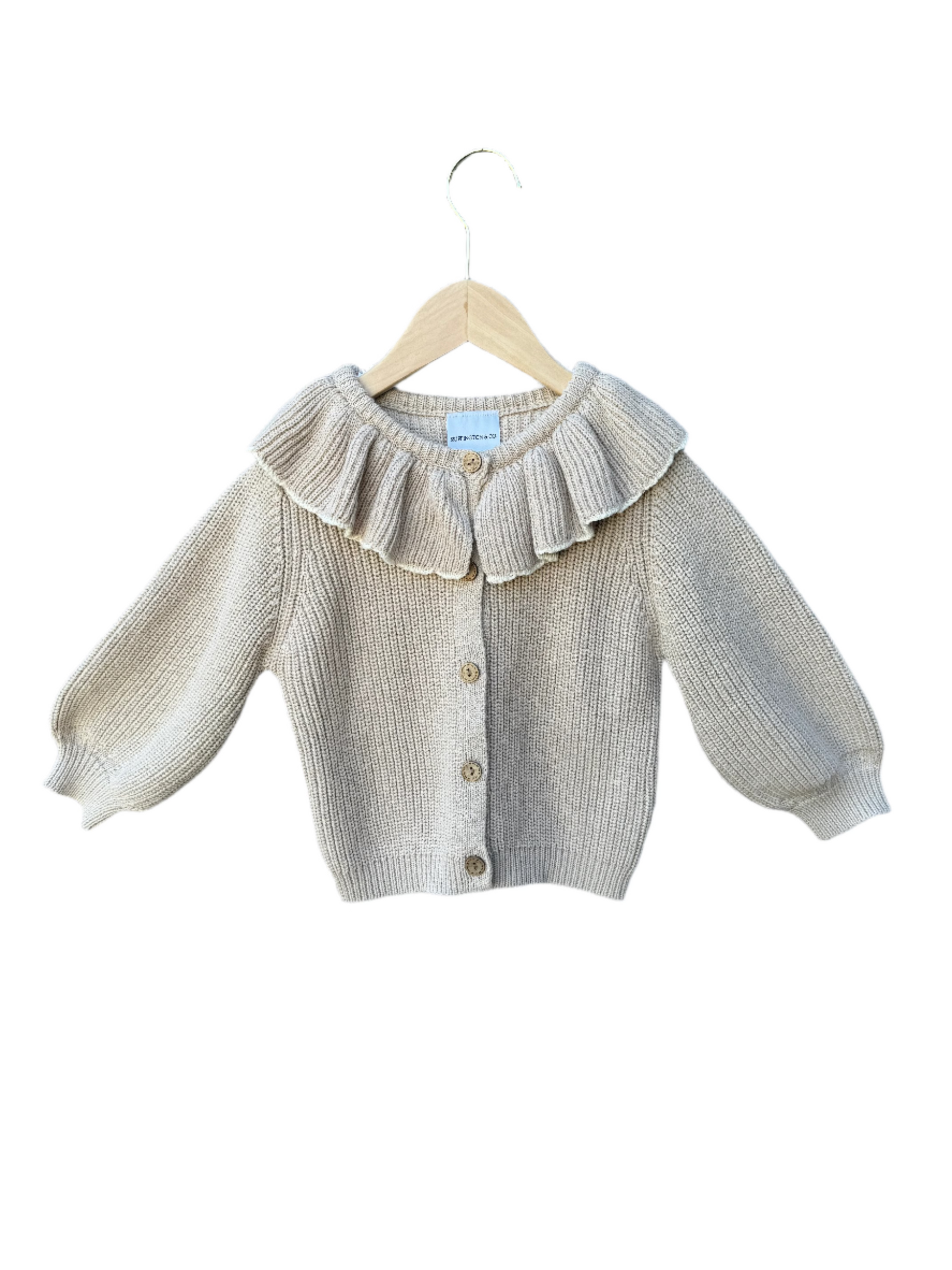 Wrap your little one up in this buttery soft, 100% cotton, classic and timeless sweater. The neutral color allows it to be paired with just about anything and the ruffled collar gives it that extra touch of elegance.